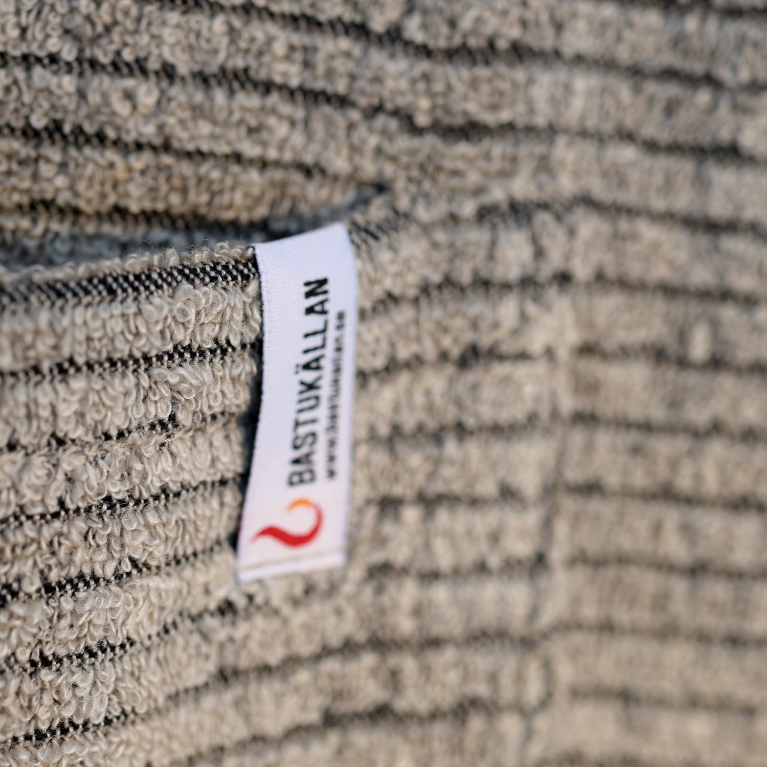 Denna bastukilt är tillverkad i frotté med god uppsugningsförmåga och en mjuk struktur som känns skön mot huden. Frottématerialet torkar snabbt och håller formen väl, vilket gör kilten till ett praktiskt val både i hemmabastun och i gemensamma relaxmiljöer. Den randiga designen i naturton ger ett tidlöst och stilrent uttryck, samtidigt som passformen är trygg och stabil för avslappnad användning.