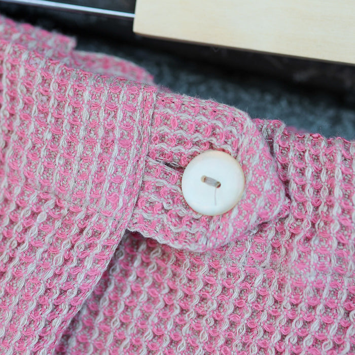En bastukilt som sitter där den ska och gör det enkelt att koppla av efter värme och bad. Den rosa våfflade strukturen ger ett mjukt, luftigt intryck och en naturligt avslappnad känsla.