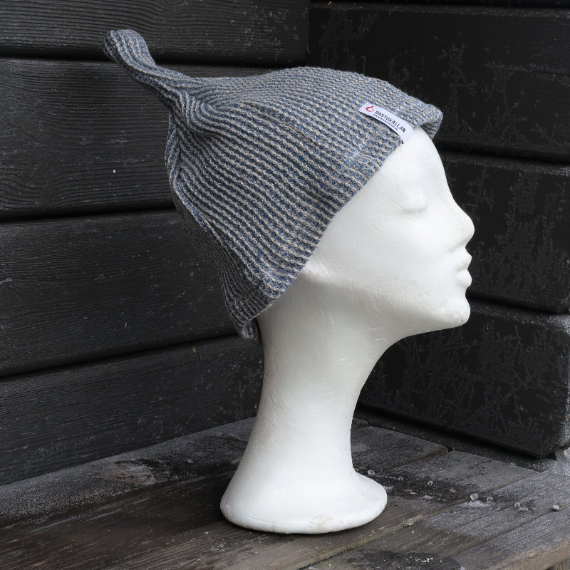 Bastumössa i våfflat linne i en mjukt blå nyans. Skyddar huvudet mot värme och ger en sval, behaglig känsla under bastubadet.