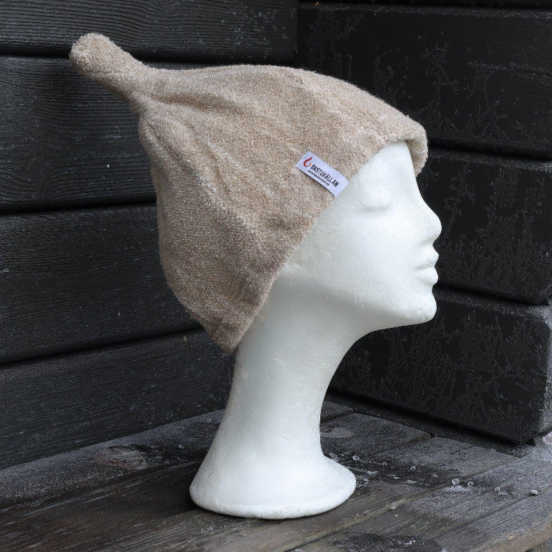Mjukt och naturligt skydd för sköna bastustunder. Denna bastumössa i lyxig linfrotté har en vacker beige ton med smala, mörkare ränder eller vit grund med ränder på alla mössor är olika, en tidlös design som passar både honom och henne.