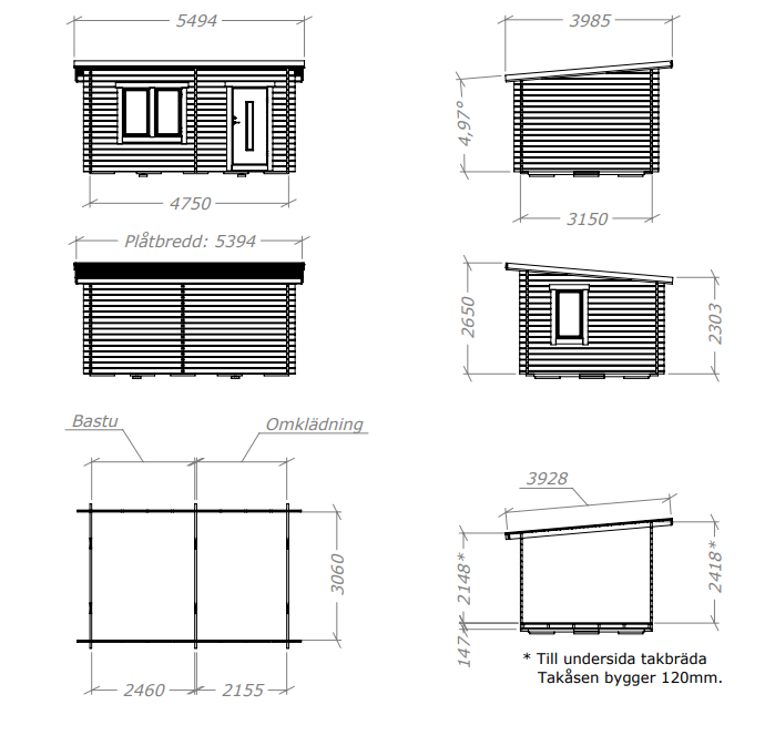 Vikt: Stugan levereras som byggsats och kommer normalt i 2st virkespaket samt 1st ytterdörr och 1st bastudörr i kartong, fönster som ingår packas normalt in i virkespaketen. Vikt totalt ca: 1610kg (per kolli ca: 1180kg / 350kg / 50kg / 30kg)