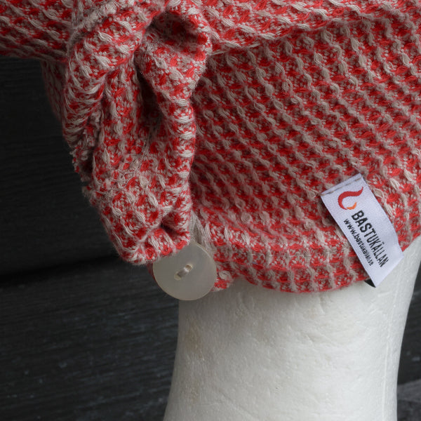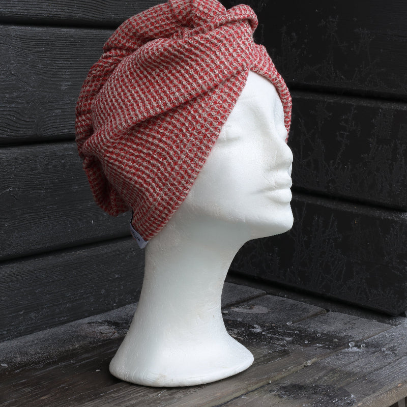 En vacker hårturban i linne som kombinerar djup röd ton med mjuka beige inslag, en naturlig och stilfull detalj i bastun. Turbanen skyddar håret från värme och gör bastustunden både bekvämare och mer avslappnad.